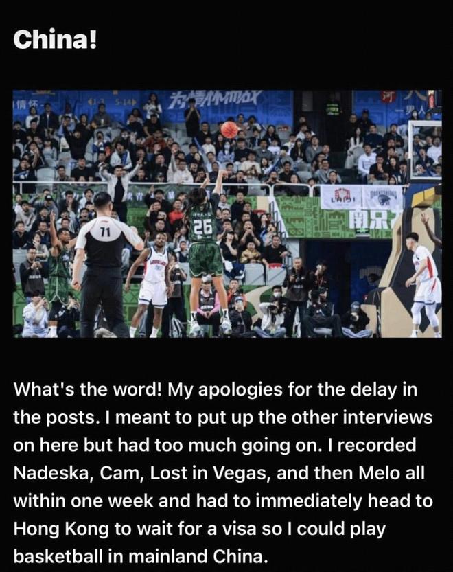 大家好!抱歉拖了这么久才更新动态。本来打算把其他采访发上来的,但最近事情实在太多了。我一周内录完了 Nadeska、Cam、Lost in Vegas 还有 Melo 的采访,紧接着就得飞去香港等签证,好来中国大陆打职业篮球。